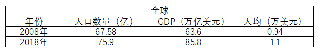上图为全球人口数量及GDP变化,经过十多年的发展全球人口增长了12.3%,人均GDP增长了34.9%。